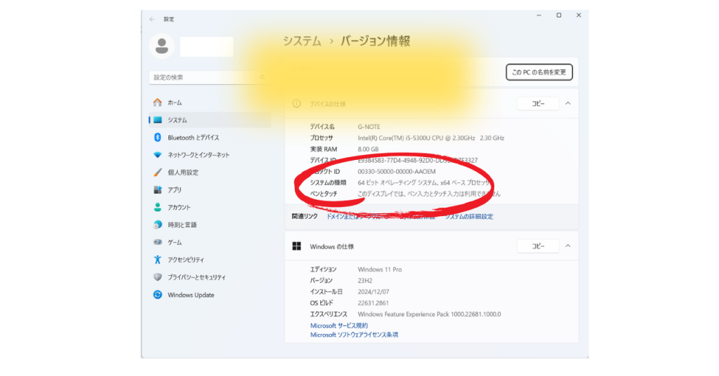 3.システム情報が表示されますので、「システムの種類」の項目を確認してください。ここに「64ビットオペレーティングシステム」または「32ビットオペレーティングシステム」と記載されています。